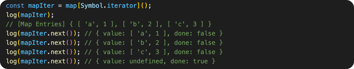 log(mapIter.next()); // {value: Array(2), done: false} // ['a', 1]