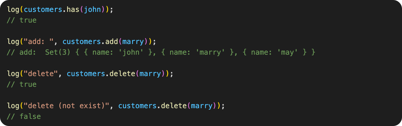 set.delete(value) : 해당 값 존재 여부에 따라, 존재시에는 해당값 제거 후 true를 반환하여, 해당값이 존재하지 않는 경우에는 false를 반환합니다.