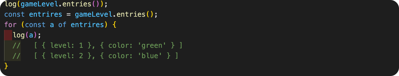 map.entrires() : [ key, value] 형태로 모든 key와 값을 반환한다. // for of를 통해 각 요소에 접근가능하다.