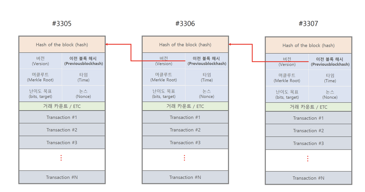 ✔️ 각각의 블록에 기록된 데이터는 인위적인 수정 변조가 불가능하다.
