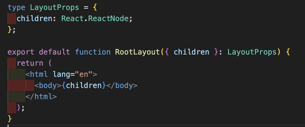 layout.tsx 파일은 필수적으로 html과 body 태그를 사용하여 레이아웃을 정의하여야 한다. 또한 해당 레이아웃이 다른 페이지들에 적용될 수 있도록 ReactNode를 props로 받아 body 안에 넣어주는 구조로 짜여져야 한다. (html과 body 태그는 root layout의 경우에만 적용되며, 루트에서 생성한 레이아웃ㅇ 파일은 모든 페이지에 적용된다.)